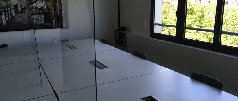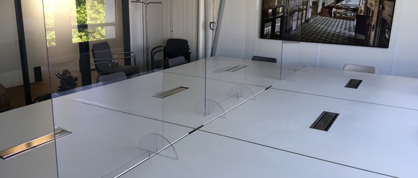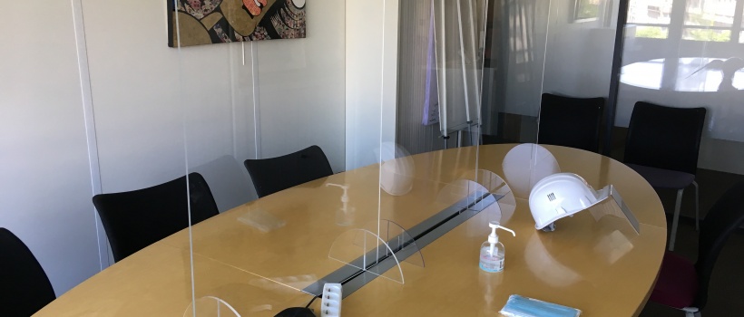 Des masques, des casques et des gels hydroalcooliques sont mis à dispositions dans le bureau et des plexiglas sont installés en salle de réunion afin de respecter les mesures nécessaires de distanciations sociales.