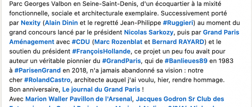 Merci à Thierry Lajoie pour son discours lors de l’anniversaire des 10 ans du Journal du Grand Paris. CDU est très heureux d’avoir contribué avec Grand Paris Aménagement, il y a maintenant 10 ans, à apporter sa pierre à l’édifice du Grand Paris avec ce projet un peu fou du « Central Park ».