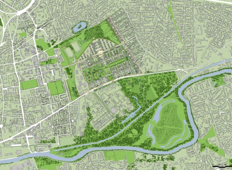 à l'extrémité de la ville, l'enceinte du quartier va s'ouvrir sur le reste de la ville. Pour s'intégrer à la fois aux quartiers existants et à la nature environnante, la densité sera progressive.